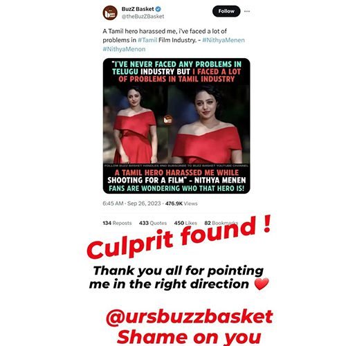 Nithya Menen slams rumours of being harassed by Tamil Actor and releases statement on Social Media